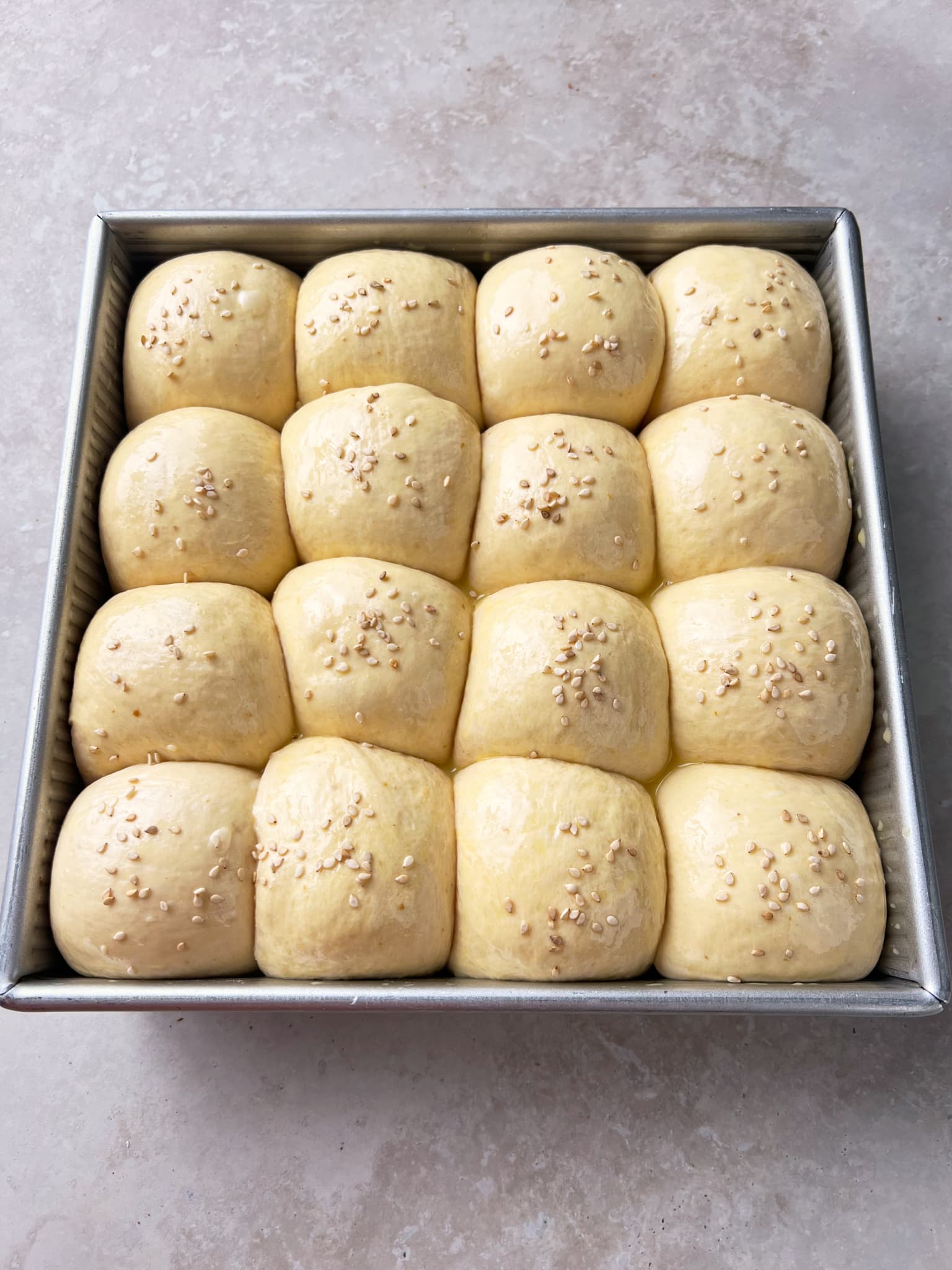 Preheat your oven to 425°F (220°C). For the egg wash, whisk together one egg and a splash of whole milk. When the oven is preheated, brush on the egg wash, sprinkle on coarse sea salt and white sesame seeds(optional), and bake for 10 minutes. Then, rotate the pan 180° in the oven and reduce the temperature to 350°F (175°C). Bake for an additional 20-25 minutes until the tops are well-colored and the rolls have reached around 204°F (95°C) internally. Remove from the oven and let cool in the baking pan for 10 minutes. Then knock the rolls out to cool on a wire rack. Let rest for 10 minutes, then enjoy.