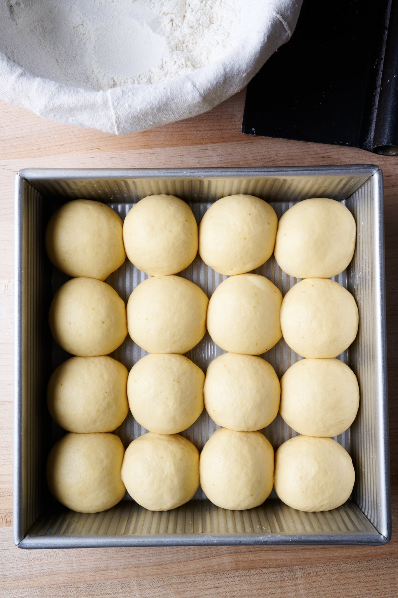 Butter your 8×8-inch square pan. Divide the dough into sixteen 70-gram pieces and shape each as a very tight ball. Place the balls in the buttered pan to proof. - Cold Proof (4:45 p.m. to 8:00 a.m.)