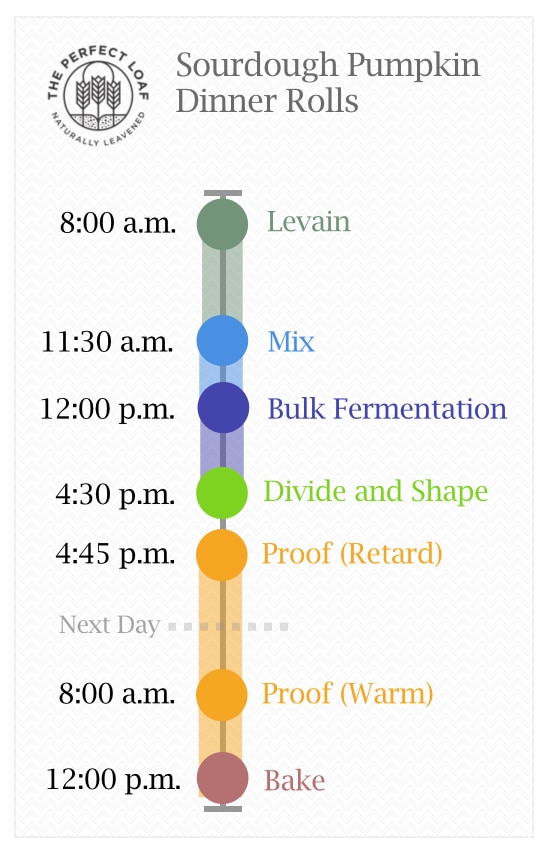 These sourdough pumpkin dinner rolls can be made in a single day or spread over the course of two. This is a rather slow-moving dough (and made worse if your kitchen is cold in the winter) and the rolls need extra time in bulk and proof. Be sure not to rush the proof, the rolls need to be very, very soft to the touch before they’re baked.