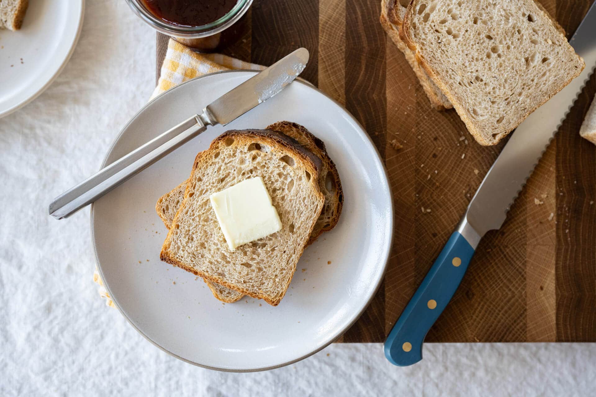 What I love about this bread—besides the tender interior, flavors created through natural fermentation, and flavorful, wheaty abundance, of course—is the shatteringly thin crust that forms when a slice is toasted (see above). We have the Pullman pan to thank here, and while a mouth-melting slice of bread is delightful, the added crunch in each slice is downright satisfying. And I think this might be the secret success of this bread: it’s soft, without excessive oil, eggs, or butter, for kiddos to love it, but still shores up enough strength to carry any ingredient you throw at it.