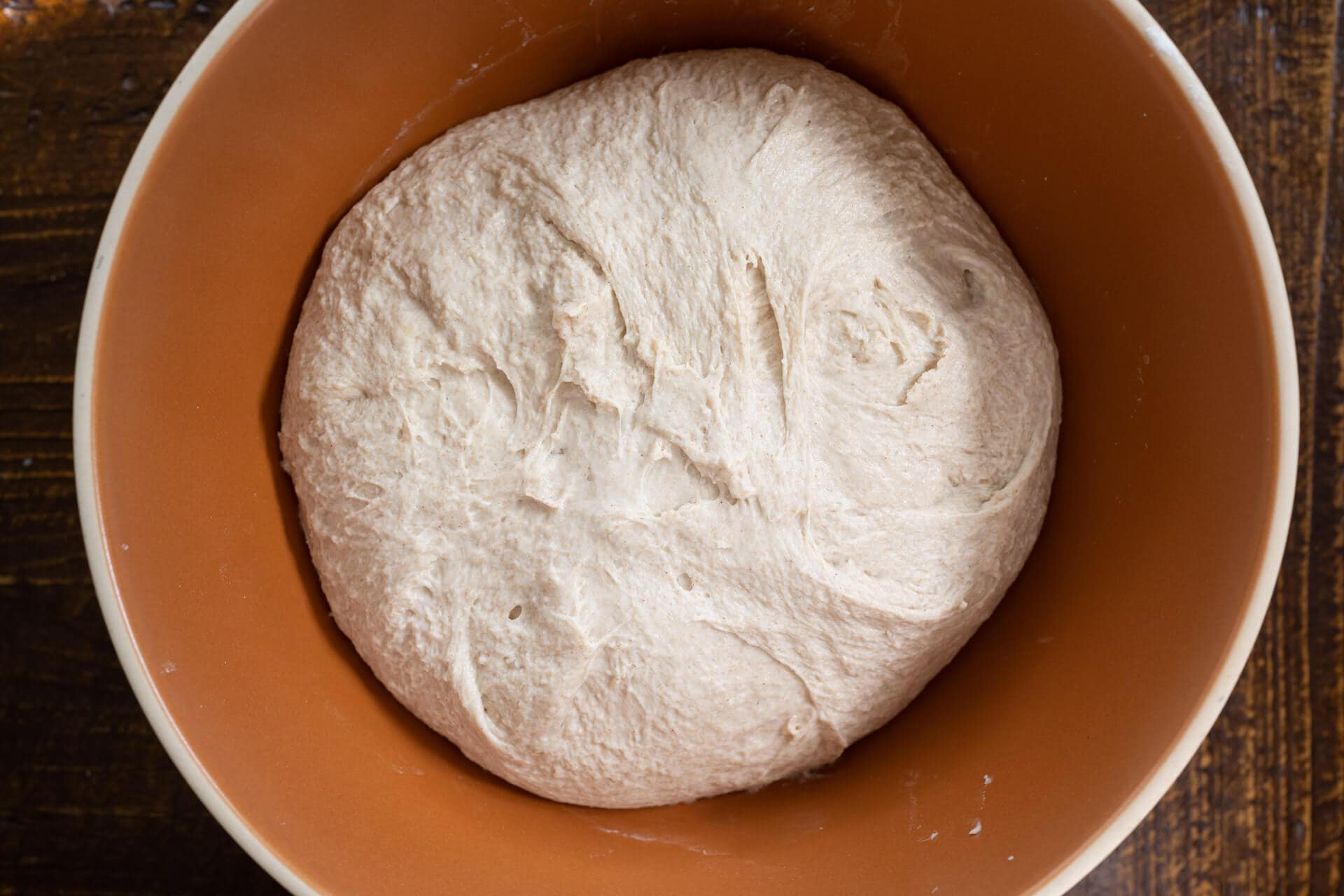 At room temperature, around 72-74°F (22-23°C), bulk should take about 3 1/2 hours. Give this dough three sets of stretch and folds during bulk fermentation (first rise) at 30-minute intervals, where the first set starts after 30 minutes from the start of bulk fermentation. For each set, wet your hands, grab one side and stretch it up and over the dough to the other side. Rotate the bowl 180° and perform another stretch and fold (this forms a long rectangle in the bowl). Then, rotate the bowl 90° and do another stretch and fold. Finally, turn the bowl 180° and do one last stretch and fold. You should have the dough neatly folded up in the bowl.