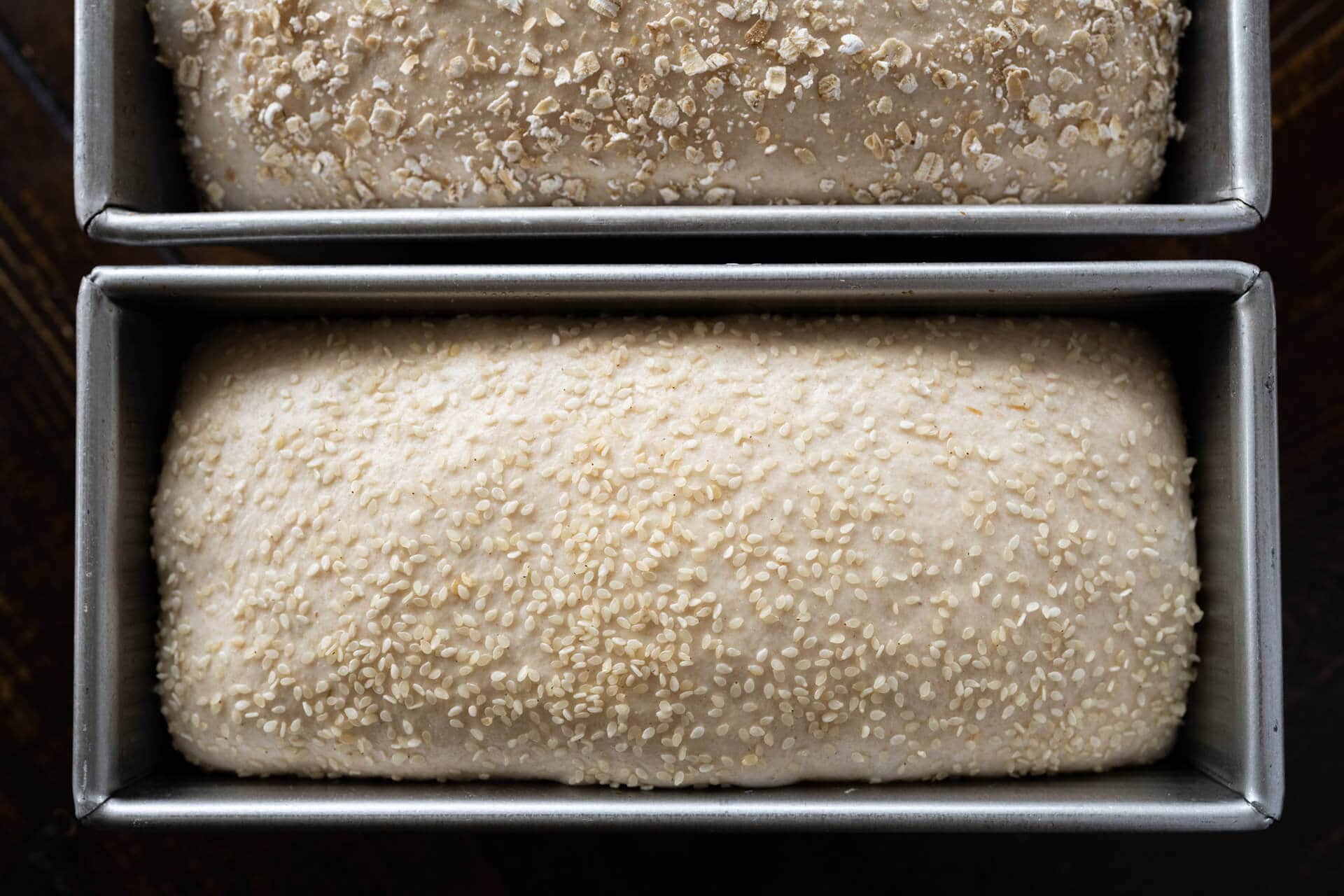 Once the dough is shaped into a long tube, transfer each to their pan, seam-side-down. At this point, you can sprinkle on any toppings you’d like, I added white sesame seeds to one loaf, and instant oats to the other.