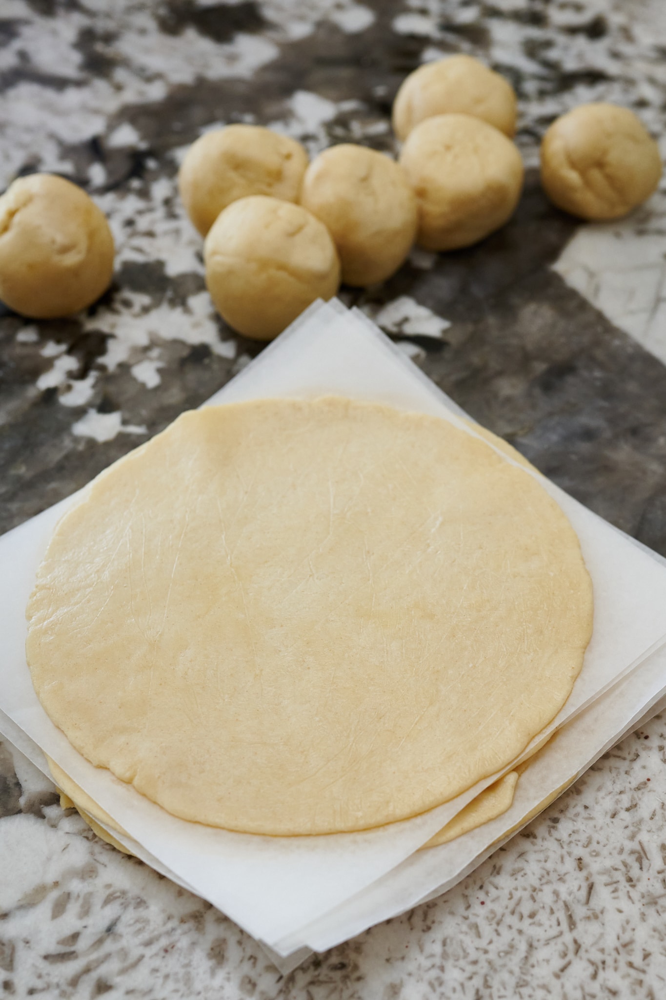 - On a very lightly floured work surface, use your hands to flatten each ball into a disc. Then, using a rolling pin, roll each disc until it is about 6 inches in diameter. (If you have a tortilla press, you can use it to flatten the balls, but you’ll probably want to finish them with a rolling pin anyway—these are best when they are pretty thin.) Transfer each tortilla to a sheet of parchment or waxed paper, stacking the tortillas between sheets of paper so that they are flat and not touching. Freeze the tortillas for about 1 hour.