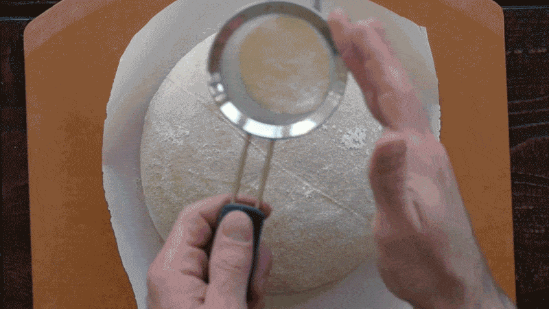 Take out your first boule and cut a piece of parchment paper to fit over your round banneton. Place the peel on top of the banneton and quickly invert the entire stack (banneton, parchment, and peel), gently pull off the basket and your dough should now be resting on the parchment that’s on top of the peel. Using a small sifter and some white rice flour lightly cover the entire boule with flour. Then use your bread lame to score the top. You can see the process below.
