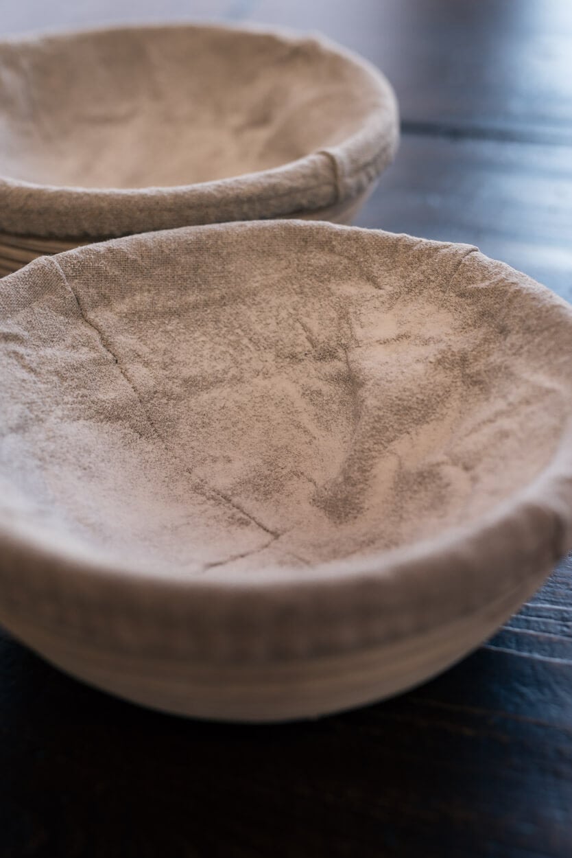 Lightly flour the top of your dough rounds and flour the work surface. Flip each round and shape into a boule. Try to get some good tension on the top of these loaves, but don’t over-handle the dough. After shaping, let rest on the bench for a few minutes and then place into a banneton seam-side-up. I prefer to use linen-lined bannetons for this moderately wet dough: it removes easier from the basket, and any liquid that escapes from the dough will go into the linen, which is far easier to clean. Only lightly dust the bannetons with white rice flour, just enough so the dough easily removes from them but no more.