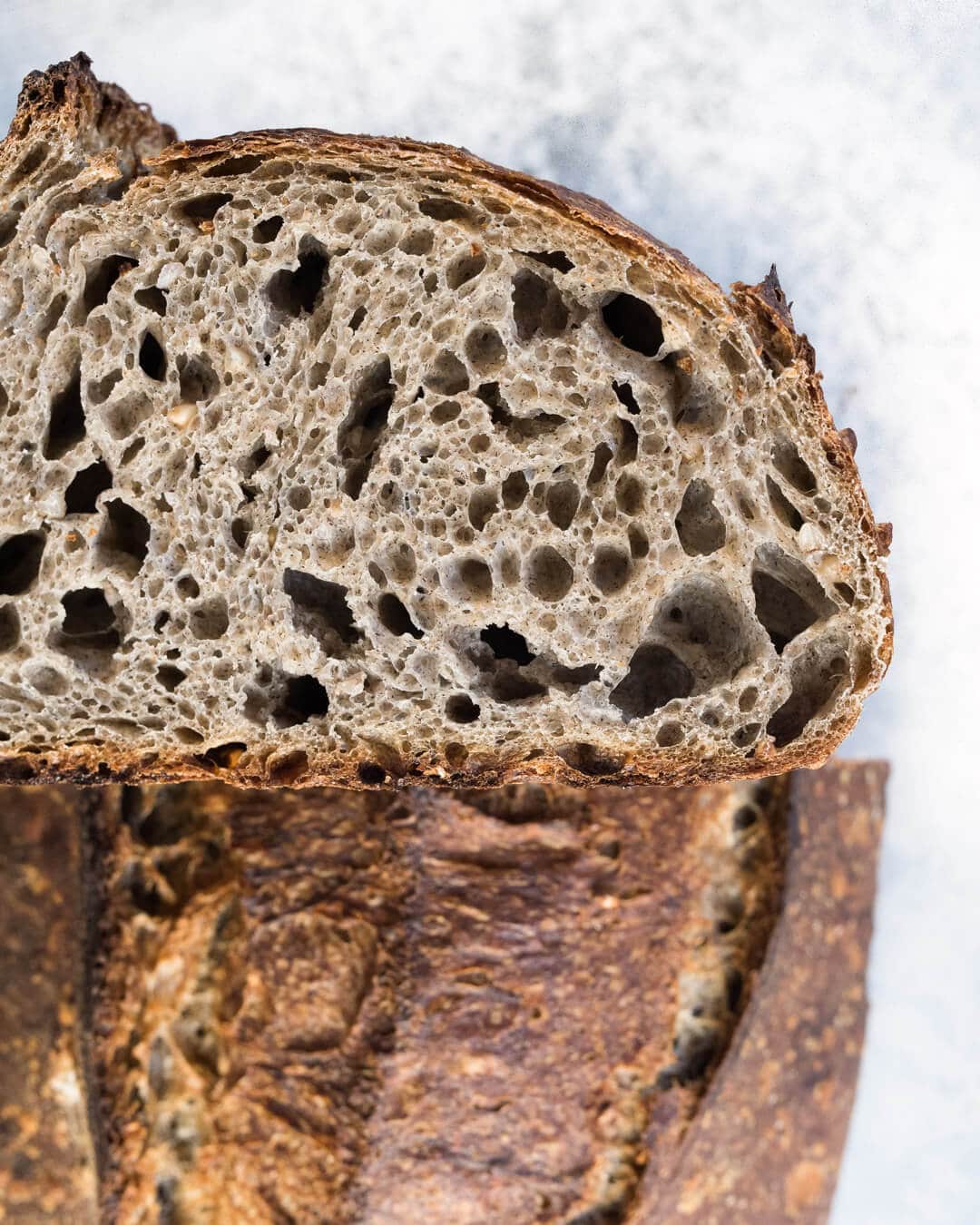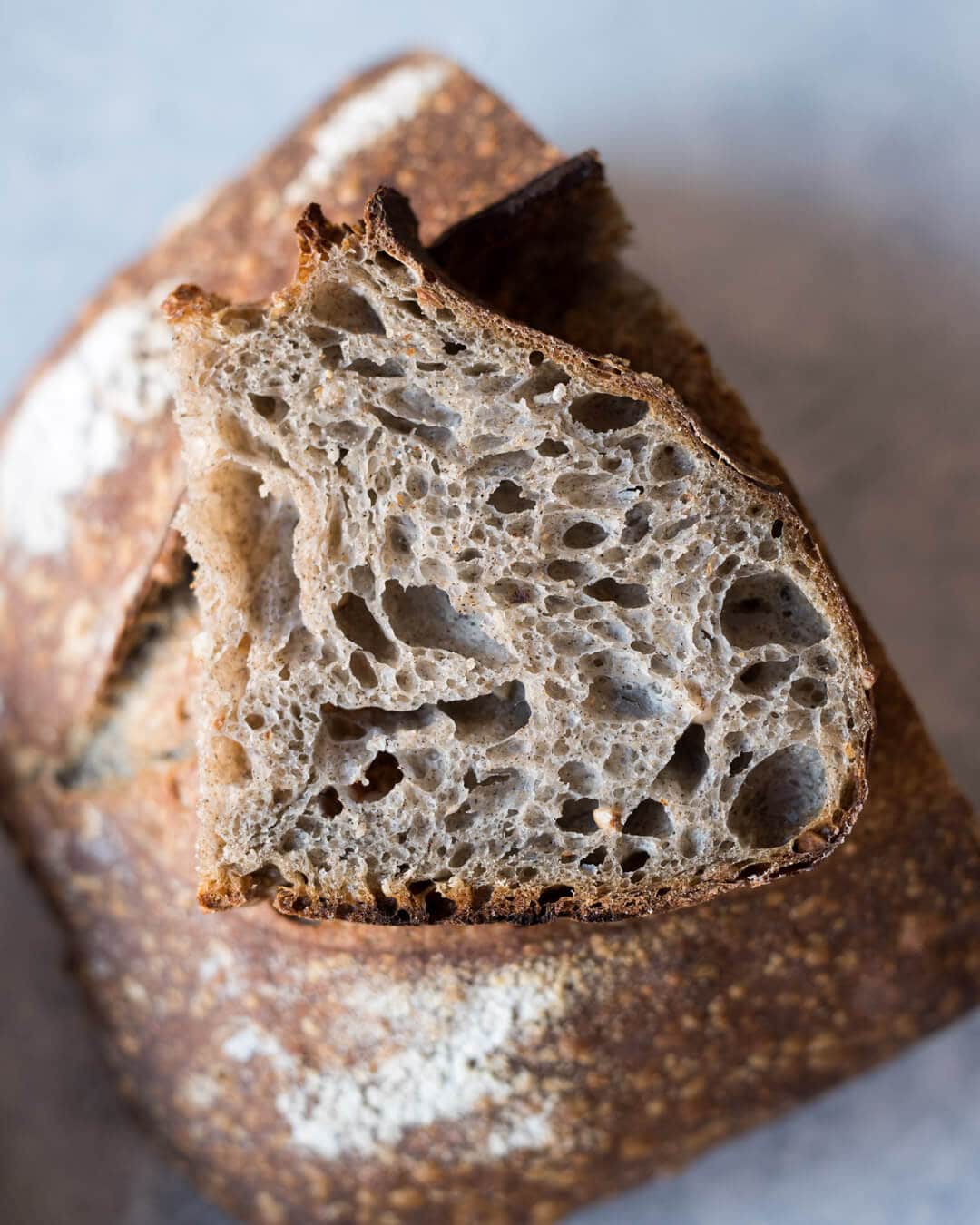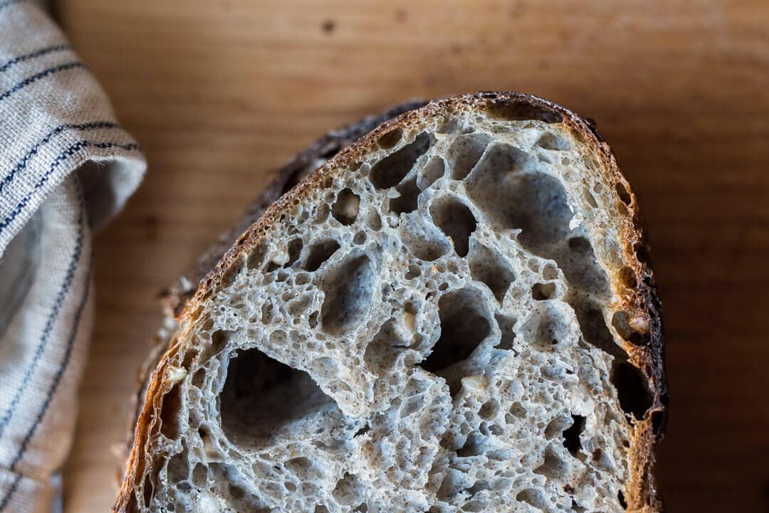 When experimenting with the total percentage of buckwheat flour used in this formula, I ran the gamut from one percent all the way up to ten percent. However, because buckwheat has no gluten, at 10% the interior of the loaf was rather dense—it was shocking how big of an impact this small percentage imparted on the structure of the loaf. Additionally, at this percentage, I felt the intense buckwheat flavor was a bit too forward, overshadowing just about everything else. I finally dialed things back to 5% and found the sweet spot: just enough of that earthy flavor without overpowering the rest of the wheat and fermentation flavors.