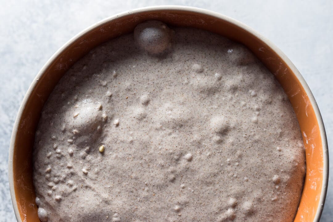 Build the liquid levain (everything listed in the Levain Build section above) in the morning and store somewhere around 77-80°F (25-26°C) ambient.