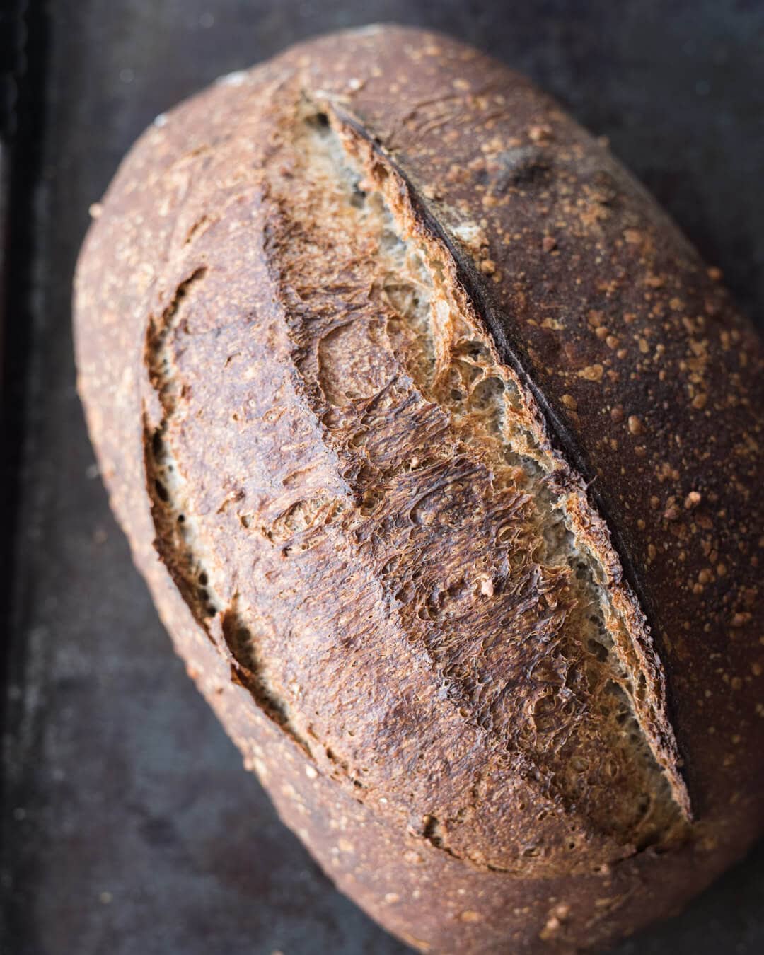 At first sight, this enigmatic sprouted buckwheat sourdough spurs the question every time: “What kind of bread is this?” The deep dark fissures and a slight gray cast are a prelude to what this bread is all about. A touch of sweetness, slightly sour, earthy, and creamy—a concert of flavors and textures in this sprouted buckwheat sourdough. This bread is a perfect companion for the cold days ahead.