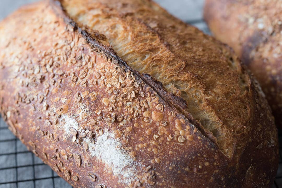 During the first test bake, I saw ample fermentation activity, boosted no doubt by the sprouted wheat flour, and so I adjusted to accommodate this in later bakes. I reduced my overall levain percentage added to the final dough mix to help compensate but still, do keep an eye on this dough during bulk fermentation and make the call to divide when you notice the dough is ready.