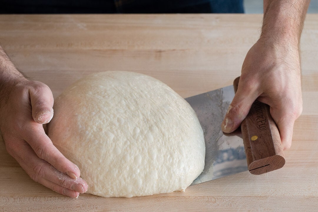 Dump the dough from the bulk container to an unfloured work surface. The dough will be a little sticky so rely on a bench knife and floured hand to gently preshape the dough into two round boules after dividing the mass in two.
