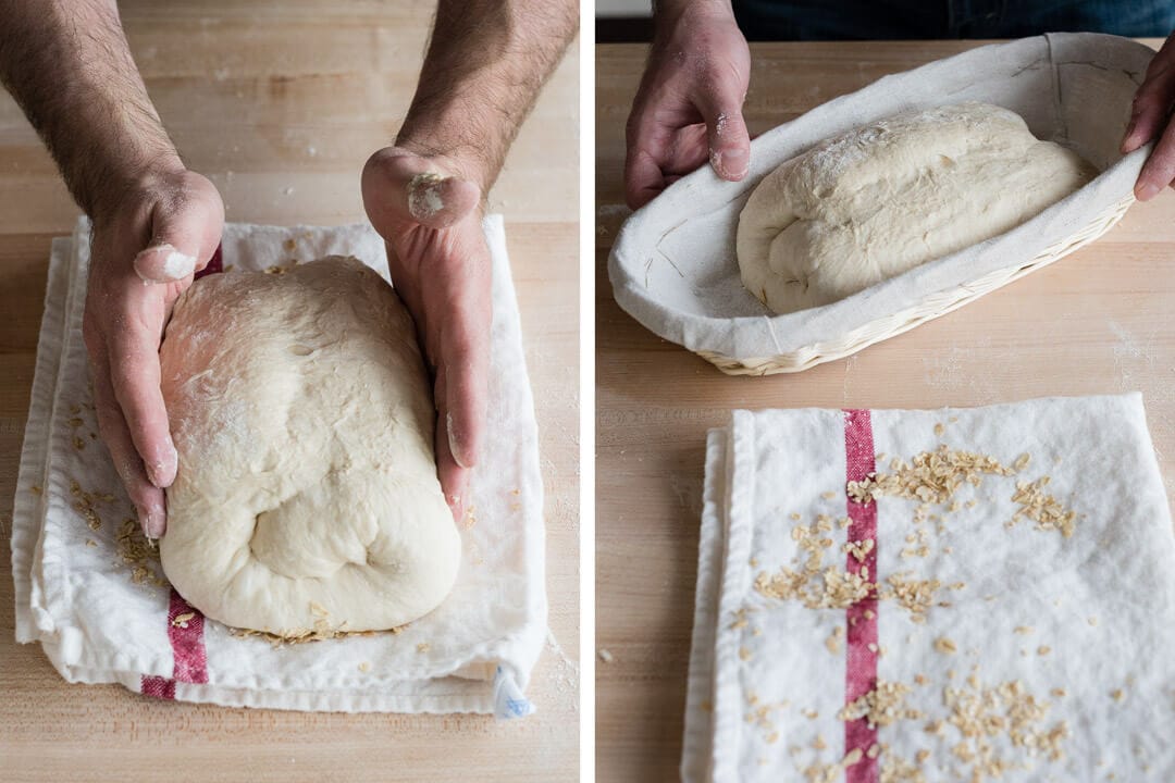 To coat your dough in raw barley flakes or oats, spread the flakes out in a thin layer on a towel. Then, prepare another towel next to it that’s slightly moist. Once your dough is shaped, gently roll the top of the loaf (with the seam still facing up) on the moist towel and then transfer to the layer of barley flakes, gently rocking it back and forth to adhere as many flakes as possible. From there, transfer the dough to a proofing basket with the seam side still facing up.