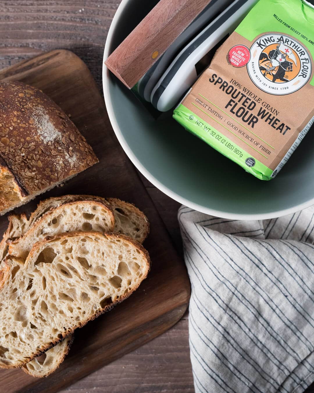 This bread is a welcome shift from some of the heartier bread I’ve been baking lately. It has a subdued, gentle flavor profile, and, according to King Arthur Flour’s sprouted wheat guide, the sprouted whole grain has high fiber content and it’s packed with added nutrition. When baking my way through several bags of this flour in testing I found each bag to perform consistently from bake to bake (they have a patent-pending process to ensure this)-always a welcome thing. I feel like this flour would be perfect in some of my other sourdough recipes, perhaps as a substitute directly for whole wheat flour (as in red whole wheat) or even half the total white flour in a formula. I do know one thing, I can’t wait to try this out with my mostly whole wheat sandwich bread.