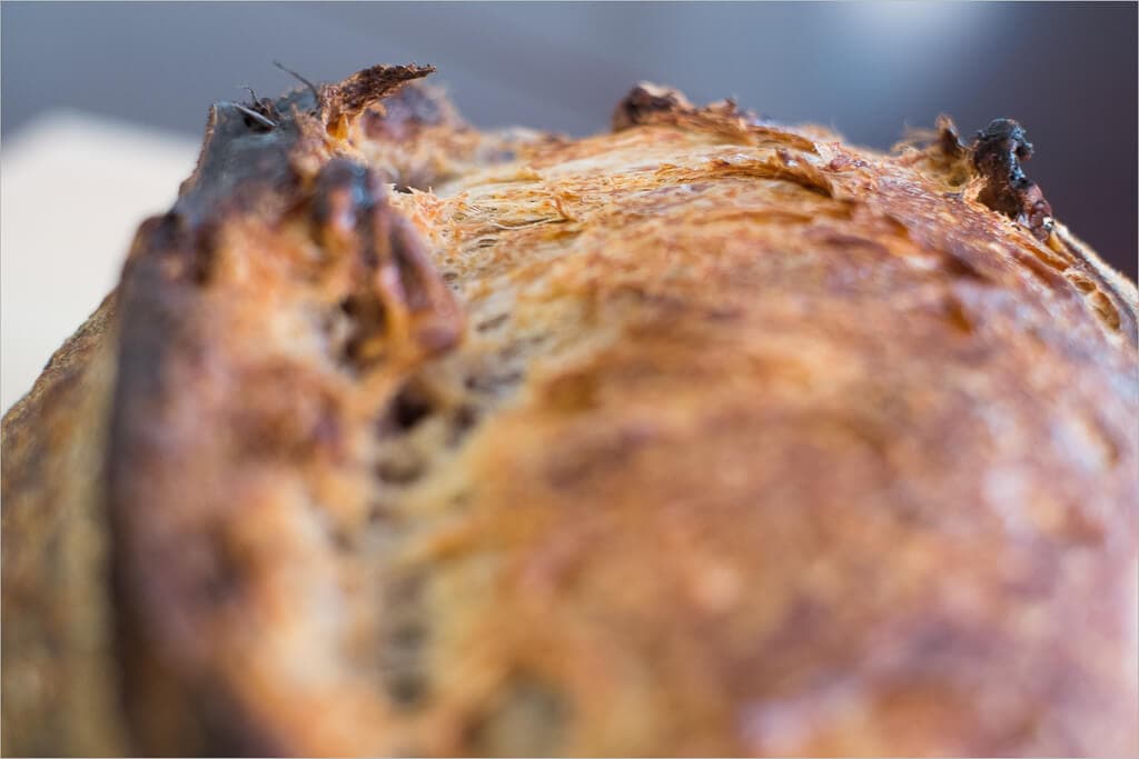 If you follow the times I’ve listed here you can generally see my proof times are around 16-18 hours long. That’s a long time! I think normally when you go this long, even in a cold environment, you would get a more sour loaf than what I end up with. One reason my loaves end up having just a hint of sourness is because of the way I manage my starter. I feed it regularly 3 times a day, once when waking, once in the mid-day, and once before bed. These frequent feedings, combined with only transferring a small amount of starter to the new feeding, keeps the acid load very low. In my previous post I outlined exactly how I keep my starter “young” by following this method, if you’re interested head over and read about my feeding schedule and for a more “advanced” discussion, how I manage my starter.