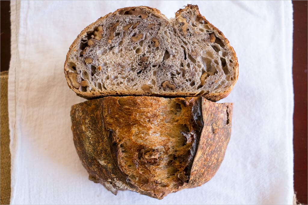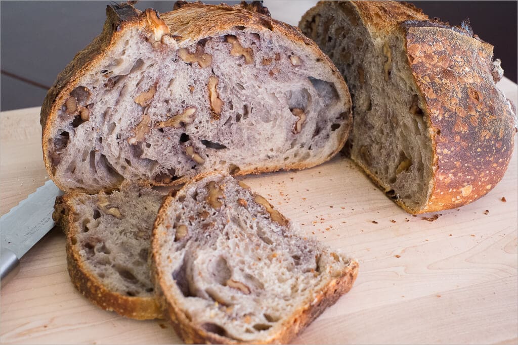 Nice and open, but not overly so. The walnuts, I believe, prevent a super airy crumb but I don’t think one can complain about these results. I’m happy with this. Also, note the purple color throughout the dough, this is caused by the tannins in walnuts that seep out during the entire process.