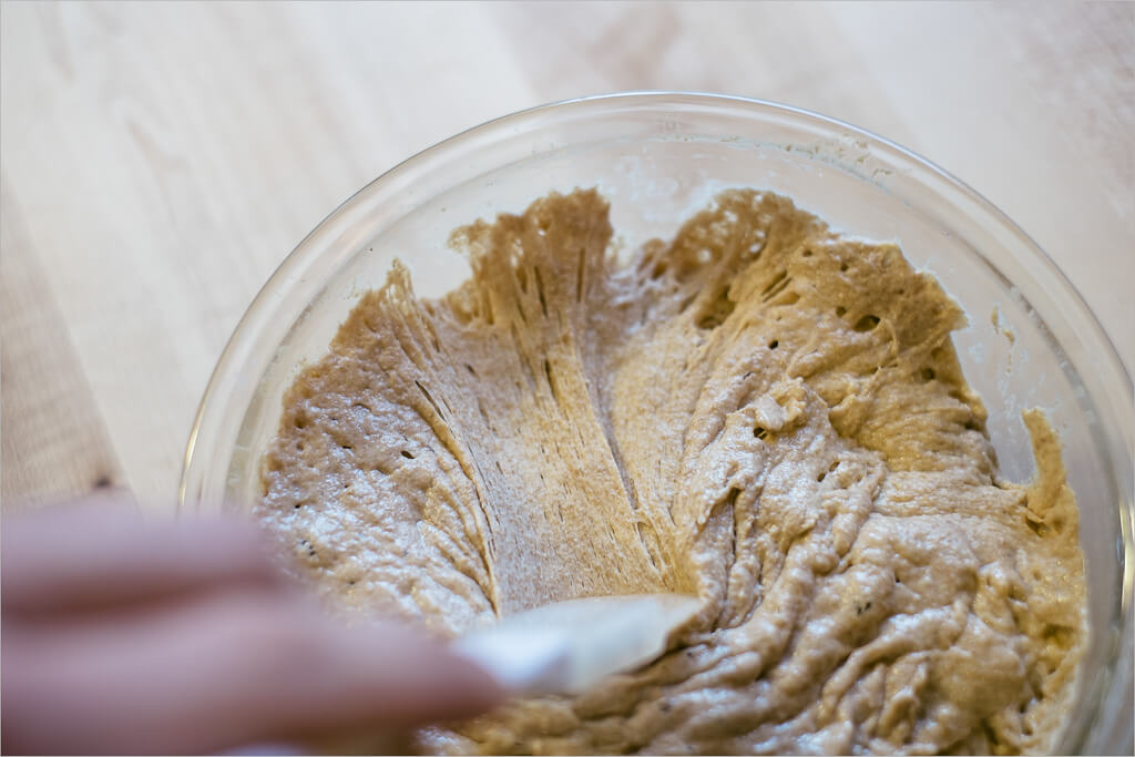 In my typical fashion, I start the process with a 100% whole wheat leaven. My starter just loves whole wheat flour and shows some real activity by the morning it’s very easy to tell when it’s ripe and ready to mix. The night before, mix and set out covered: