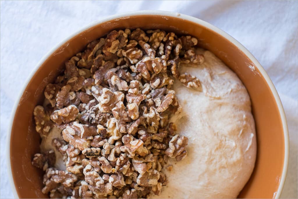 - 9:45am – Turn 2 (After the second turn is complete, add all your walnuts and mix them into the dough by cutting them in the dough with your fingers. If things feel a bit dry, add just a tad of water. )