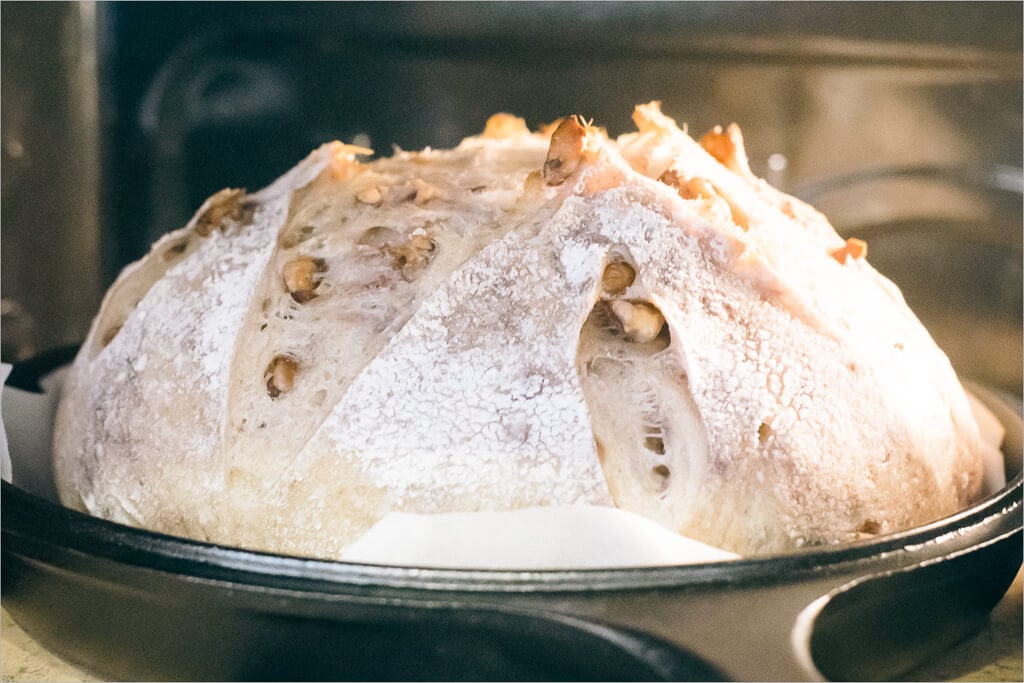 Place the dough into the combo cooker, cover with the lid, and bake for 25 minutes. After this time, remove the lid of the combo cooker (you can place it in the oven next to the bottom half or remove it) and bake for an additional 35 minutes. Below you can see the loaf I shaped into a boule in the cooker just after taking off the lid—excellent oven spring. I was tempted to pluck out a few of those walnuts, only the fear of searing my arm on the pan kept me at bay.