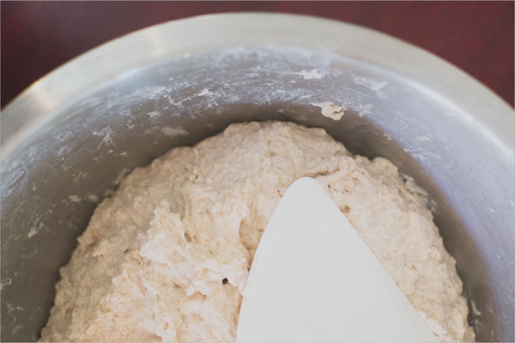 After mixing the above in a glass container, cover it and set it out on the counter for an overnight rest. I started with water, just a bit cooler than usual; I had some errands to take care of in the morning and needed more time to mix after waking up.