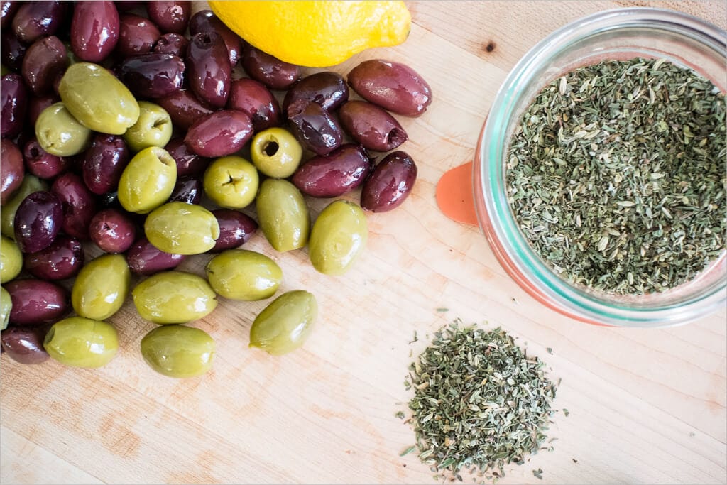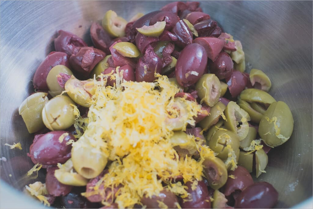 Mix the olives, herbs, and lemon zest in a medium bowl before incorporating into your dough. Set this mixture aside, and we’ll add these to the dough after the first turn; get started: