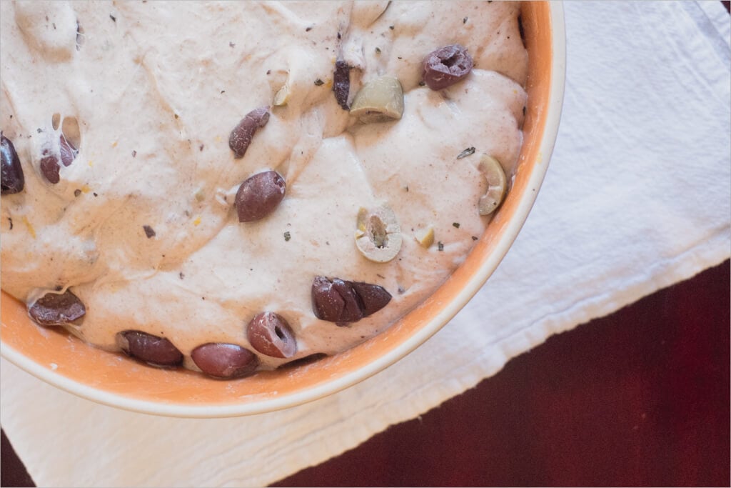 After the first turn, add 3 cups olives, 2 teaspoons herbs de Provence, and lemon zest. Mix thoroughly with your hand, and cut the olives into the dough with your thumb and index finger.