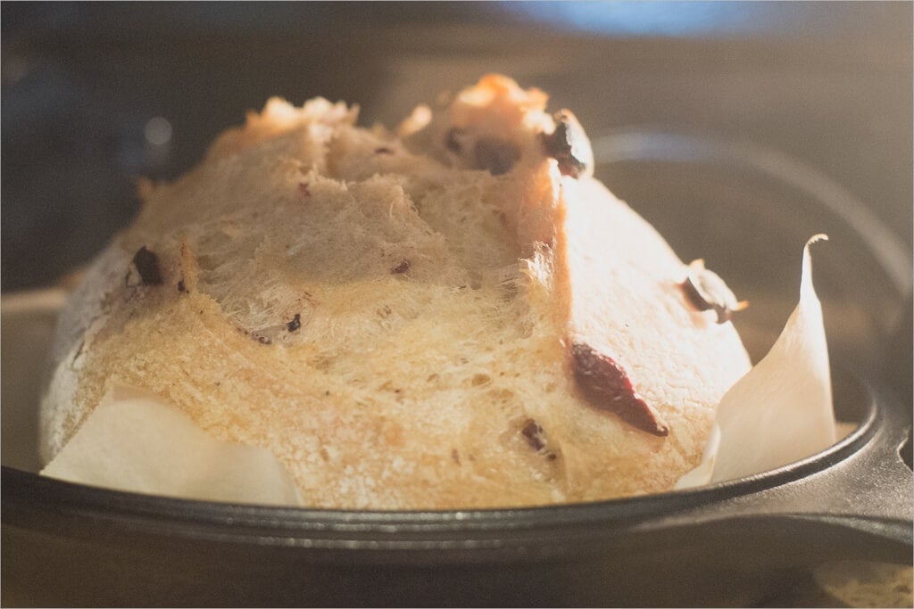 Place the dough in the combo cooker, turn the heat down to 450°F (230°C), and bake for 20 minutes. After this time, open the oven, remove the top lid of the combo cooker, close, and bake for an additional 35 minutes or until done to your liking.
