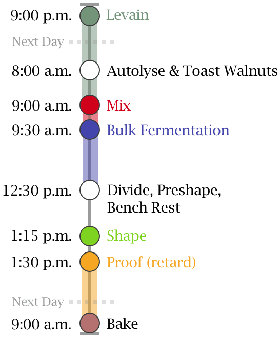 Preheat your oven to 350°F (175°C). Spread the 160g walnuts out evenly on a sheet pan and bake for 10 to 15 minutes until they start to take on a little color and become very fragrant. Keep an eye on them; they can burn quickly. Set aside until called for during bulk fermentation.