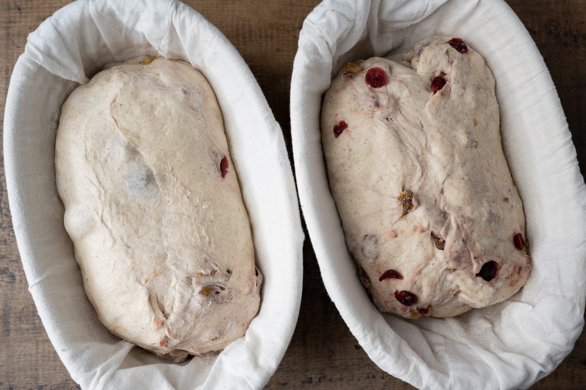 After the dough is shaped, place it seam side up in a proofing basket lined with canvas or a clean kitchen towel. I recommend lining your proofing basket because the red cranberries can ooze out a bit of color during the long, cold-proof. I like to use smaller, 10″ proofing baskets for this dough to keep it in a tighter shape during proof.