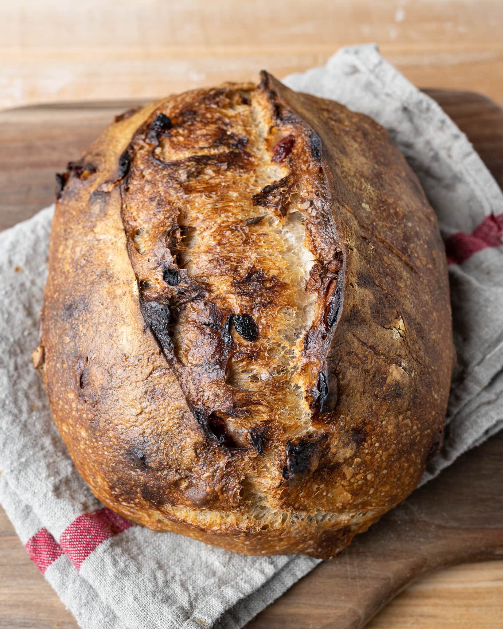 A delicious loaf of sourdough bread padded with tart and sweet cranberries and earthy walnuts, all tied together with a small addition of roasted walnut oil. This is one of the most flavorful bread recipes I bake, and there’s a good reason it’s also one of the most requested—it’s delicious!