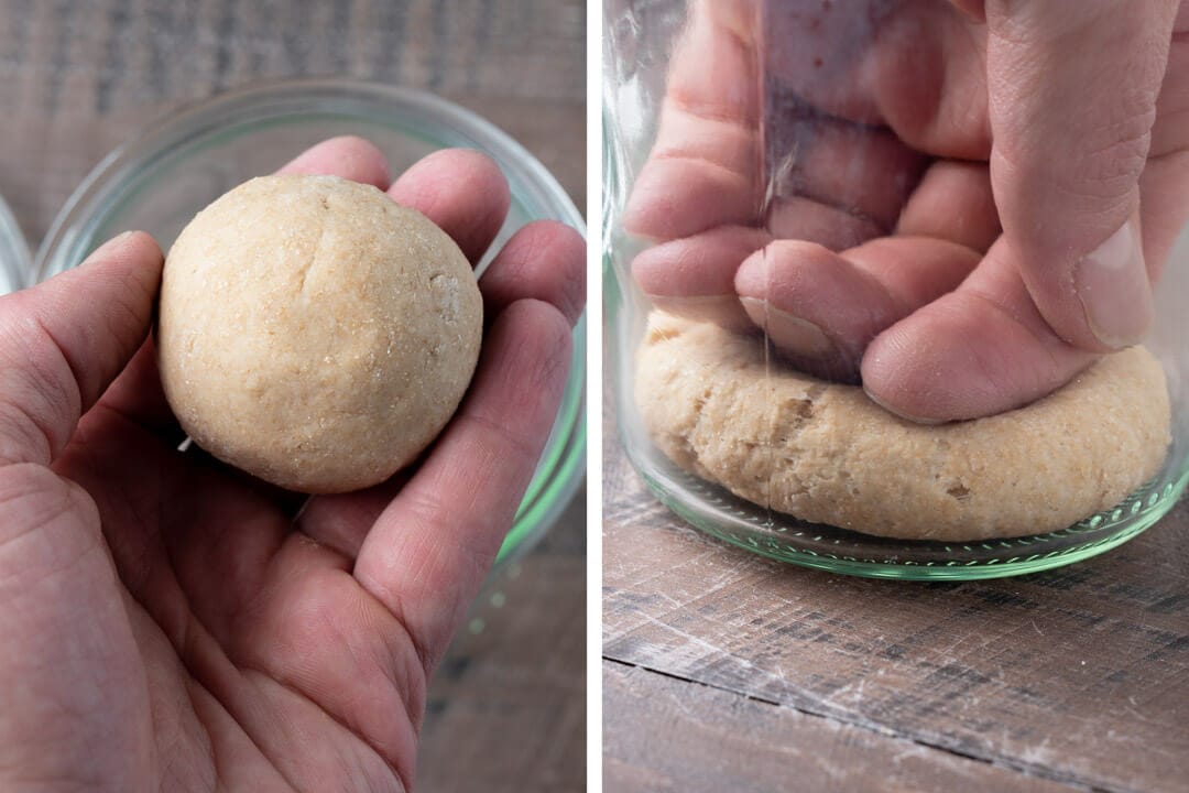To make the stiff levain, I usually mix everything up with my plastic spatula, then knead it by hand when it becomes hard to stir. Then, I shape it into a ball and press it down into the bottom of a 1/2 liter Weck glass jar. Pressing the levain down like this helps me visually inspect when it’s ready to be used: I look for a leveling off of the “dome” that is created as it’s ripening. Additionally, you’ll see significant aeration at the sides, and, if you gently poke at the top, it’ll give readily under pressure. At 50% inoculation (the percentage of ripe starter used to build the levain) my levain was ready to be mixed into the dough after 5 hours at 78-80°F (25-26°C).