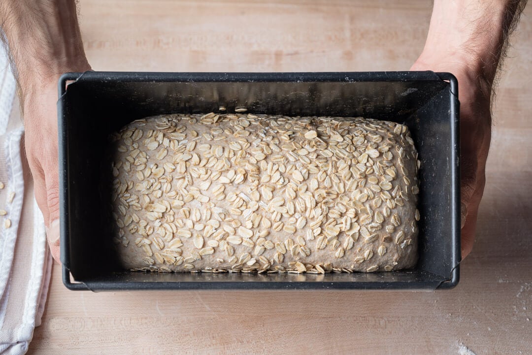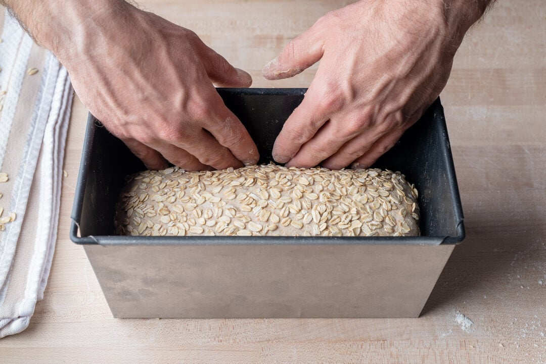 I love topping these loaves with raw, rolled oats: they crisp up in the oven and provide little bursts of toasted nut flavor when eating each slice. Lay a kitchen towel out next to your work area and spread a thin layer of thick rolled oats on top.
