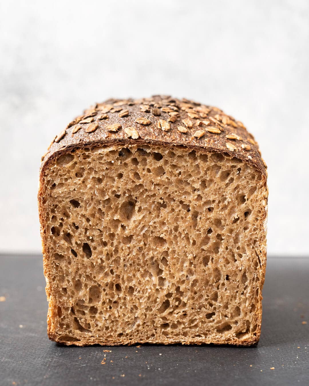 A magnificent interior for 100% fresh milled whole grain. The high hydration helps here but so does a gentle and effective final shape. It can be a challenge to retain the open structure of this dough when first topping with oats and then finally into the pan. But, as long as you get it into the tin, this bread always bakes up nice.