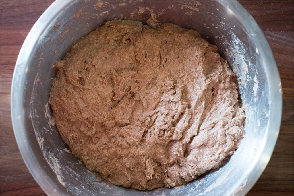 By the end of bulk fermentation, the dough looked a little puffy and jiggly in the bowl. You won’t see as much puff as you would with white bread, but the dough should not look like it’s completely flat in there. You want a little rise in the center, or in other words, it holds its shape more than when you started.