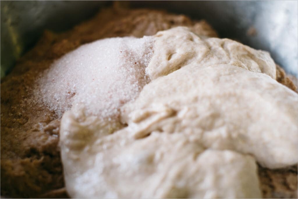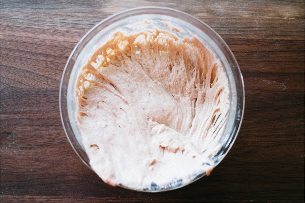 In addition to ingredient changes, we’re going to change up the method just a tad. The normal autolyse time of 30-45 minutes is about to be increased on you to a full 2 hours. Increasing the autolyse time helps to soften and add extensibility to your dough, which is very important with whole wheat bread. If you were to do a short autolyse time of, say, 30 minutes, you’d notice the dough would be tough to mix and turn. It’s super elastic, meaning it springs back when you stretch it out. You want it to be more extensible (meaning it stretches out without too much resistance without tearing), so you get a higher rise at bake time. Check out my full guide to the autolyse technique for more on its benefits.